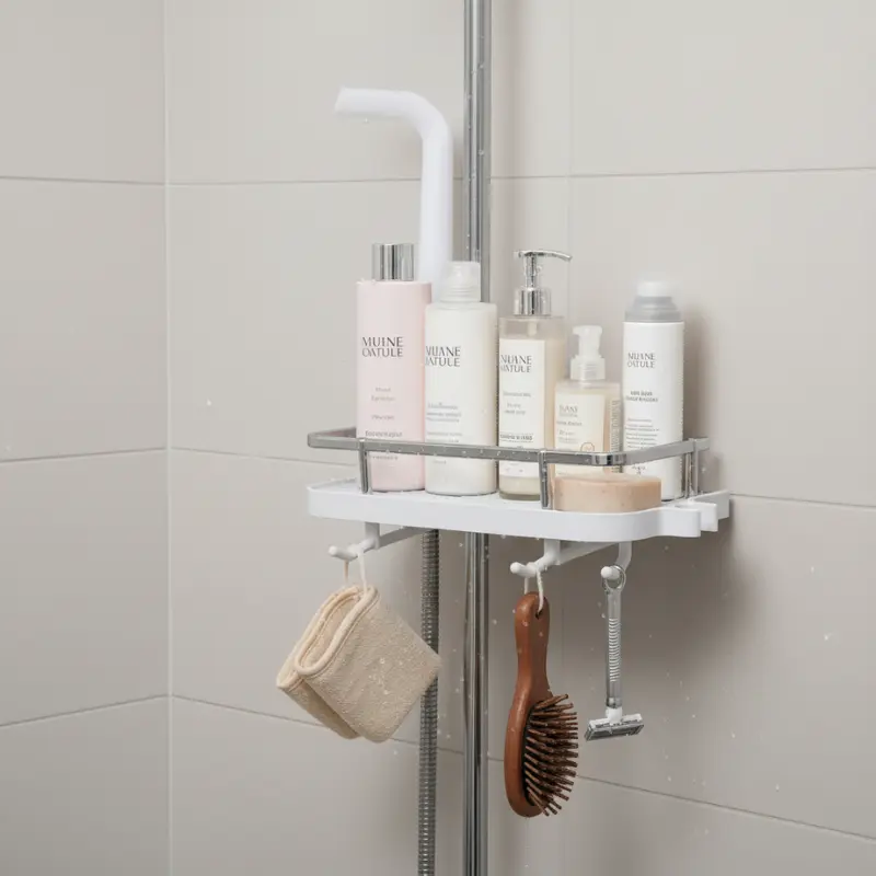 Tämä järjestäjä lisää turvallisen säilytyksen käyttämällä olemassa olevaa suihkutankoa – siisti asennus, siisti ulkonäkö.
